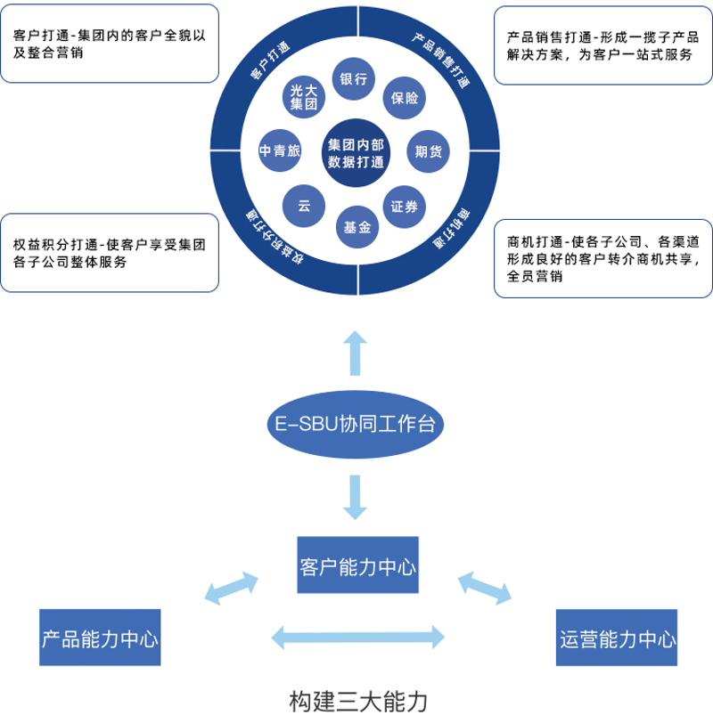 通过打造智能协同平台,构建客户、产品、运营三大能力中心,实现客户、产品、商机、营销、权益资源的共享,拉通内部企业和外部合作伙伴,建设合作共赢的生态圈。