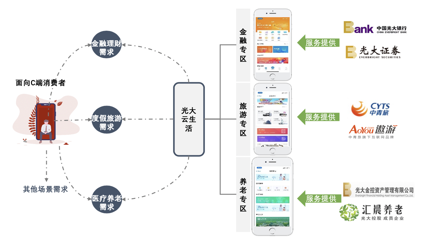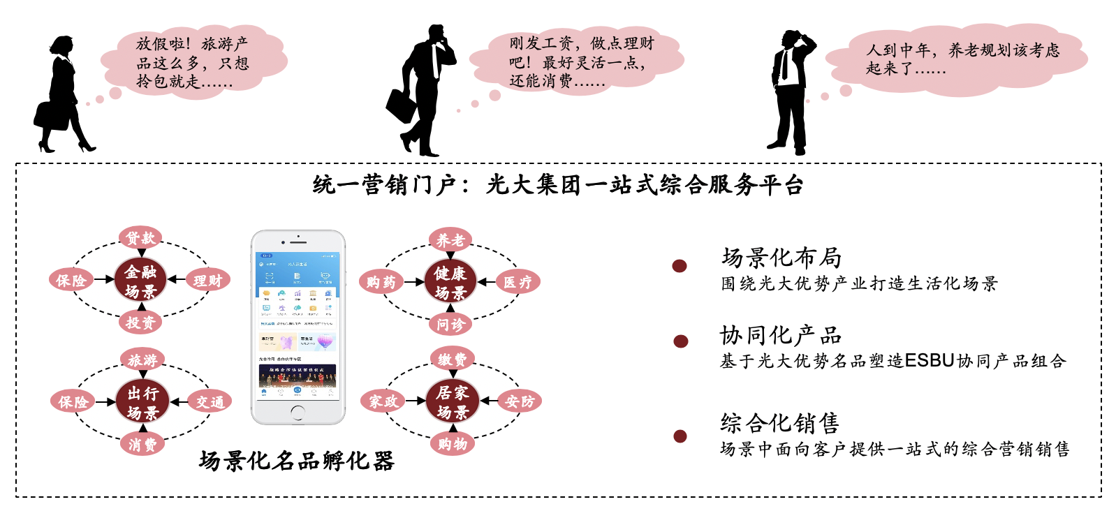 统一营销门户对外定位于集团的一站式综合服务平台,对内定位于集团的场景化名品孵化器,借助场景化的组合名品为C端客户提供一站式综合解决方案。