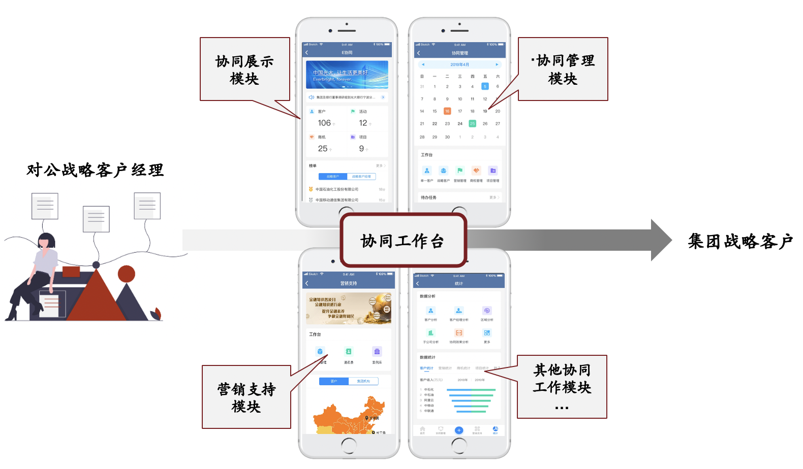 协同工作平台基于资源连接、协同作业支持、管理推动,实现集团战略客户、对公客户、个人客户的协同目标实现。