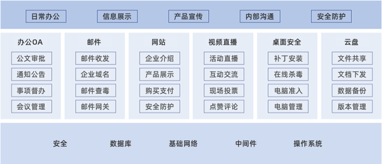 该解决方案解决了日常办公、信息宣传、内部沟通等全方位办公需求,通过整合集成,发挥整体优势,减少企业整体费用投入。