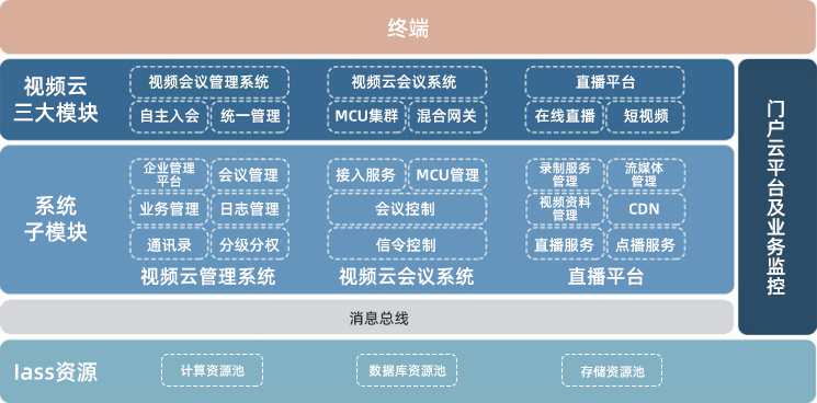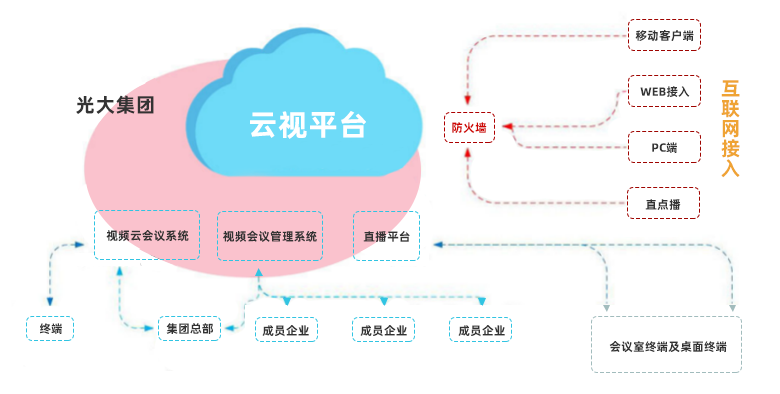 云视平台整体包含三大模块:视频会议管理系统、视频云会议系统、直播平台。是澳门金沙集团 基于第三方产品,充分利用5G和云计算技术研发成功的光大自有远程会议整体解决方案,方案制定经过同光大银行信息科技部等单位充分沟通,确保实现全集团视频会议资源共享整合,澳门金沙集团 对该产品拥有自主知识产权。