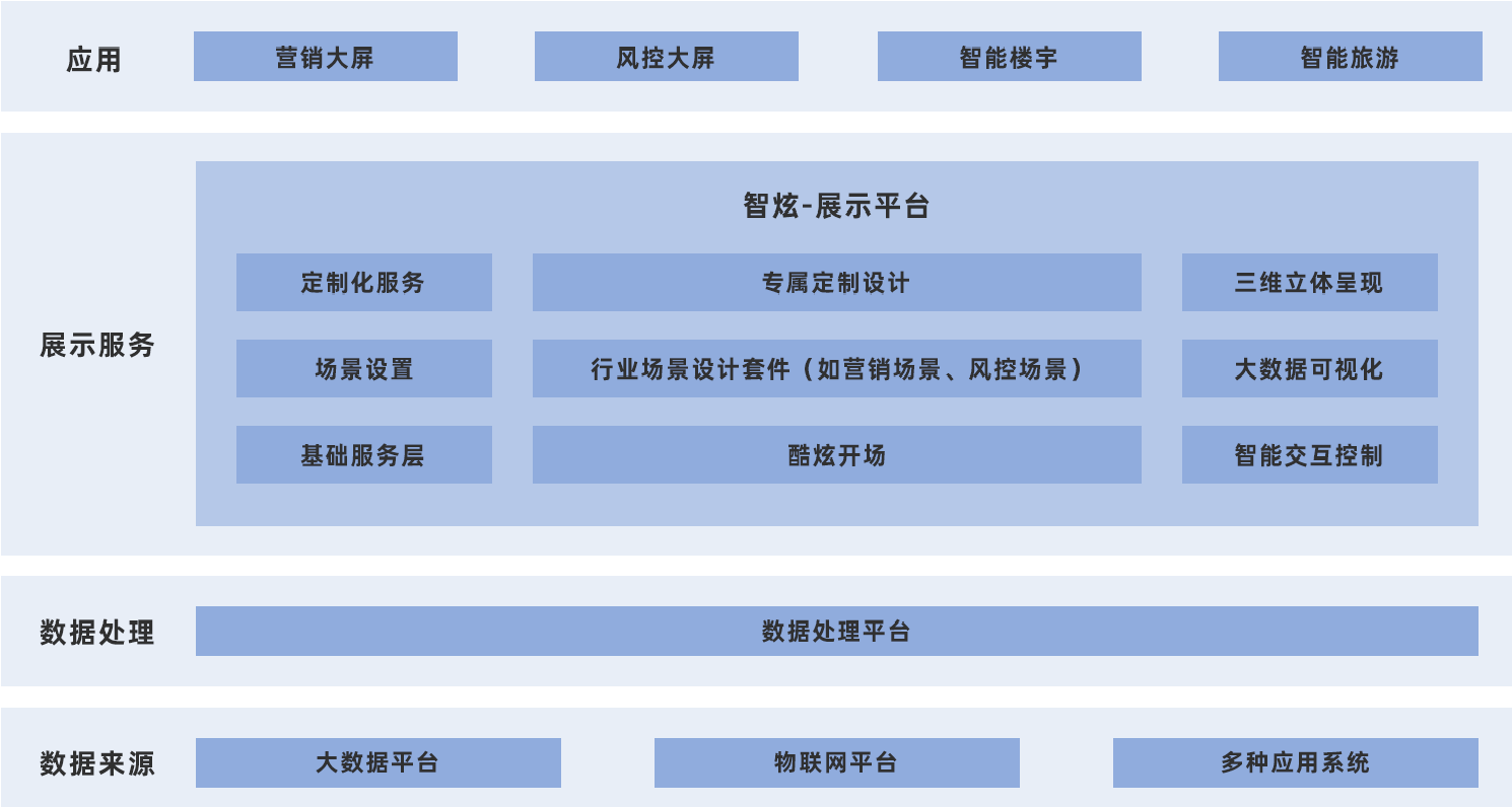 智慧大屏是基于公共开放空间通过三维数据可视化技术提供的大屏可视化能力,形成强烈炫酷的视觉冲击,以最艺术化的展现形式,最人性化的交互方式,对大数据进行可视化分析,沉浸式交互,以达到对外提升品牌形象、对内提升内部管理、监测态势感知、指挥调度、决策分析支持等效果。