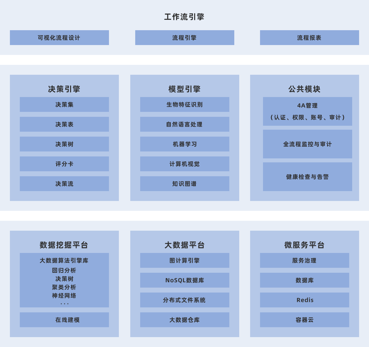 从多维度、多层次分析用户风险特征,对业务申请、授信调查、审查审批、放款审核、贷后监控、逾期管理等环节的风险进行识别防控。