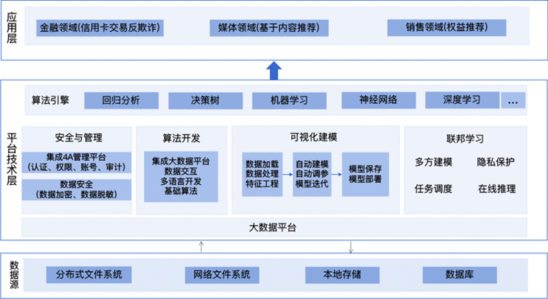 数据科学平台是面向数据存储、数据获取、模型训练、模型部署以及结果预测一体化的一款大数据挖掘产品,该平台能够通过对大规模数据集的处理,提高数据处理效率,依据机器学习、深度学习模型进行模型训练,帮助用户提供准实时的建模能力,当面对数据碎片化和数据隔离时,通过加密机制下的参数交换方式建立虚拟的共有模型,在充分保障各个参与方的隐私信息和数据安全的同时,多方联合建模满足对特定的业务场景数据分析的需求。